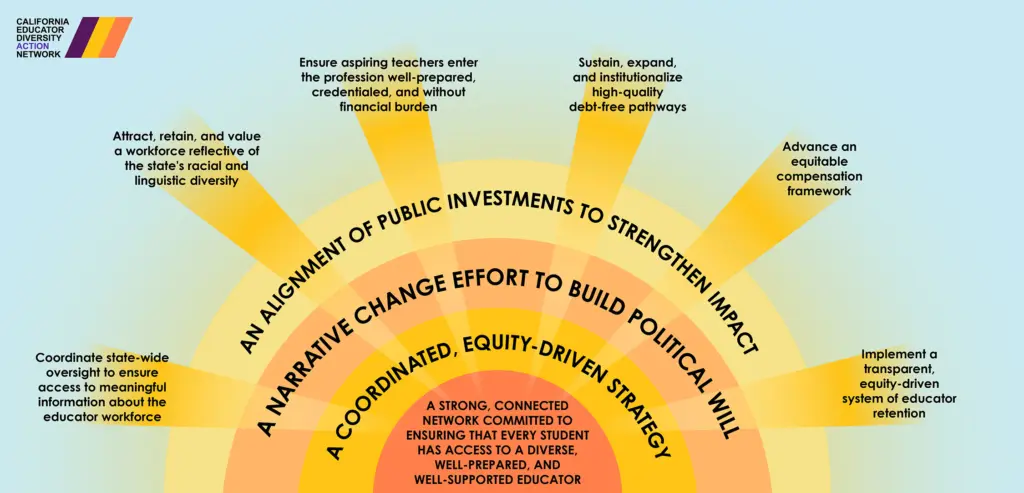 Inspired by the clear evidence that California’s young people were not getting equitable access to high quality, diverse educators that research shows are essential to improving their academic outcomes, a group of educators and community advocates from across the state gathered in Sacramento in 2023 to talk about the educator shortage crisis in California. They were clear that this “shortage” was the product of a longstanding, shortsighted vision for what educators and students need to thrive. These founding educators and community advocates were not interested in simply “filling vacancies.” They wanted to fill an unmet promise. They wanted diverse educators to enter a profession capable of not only retaining great educators, but inspiring future ones.